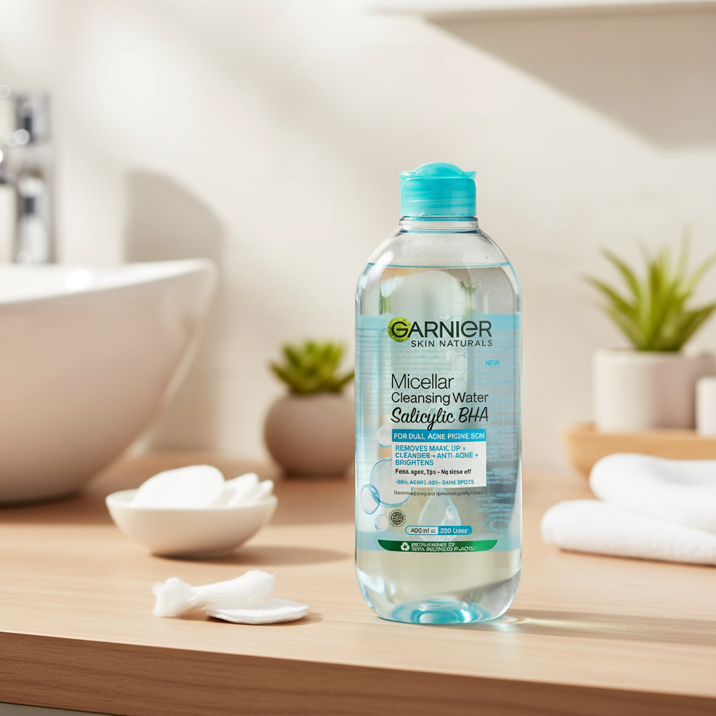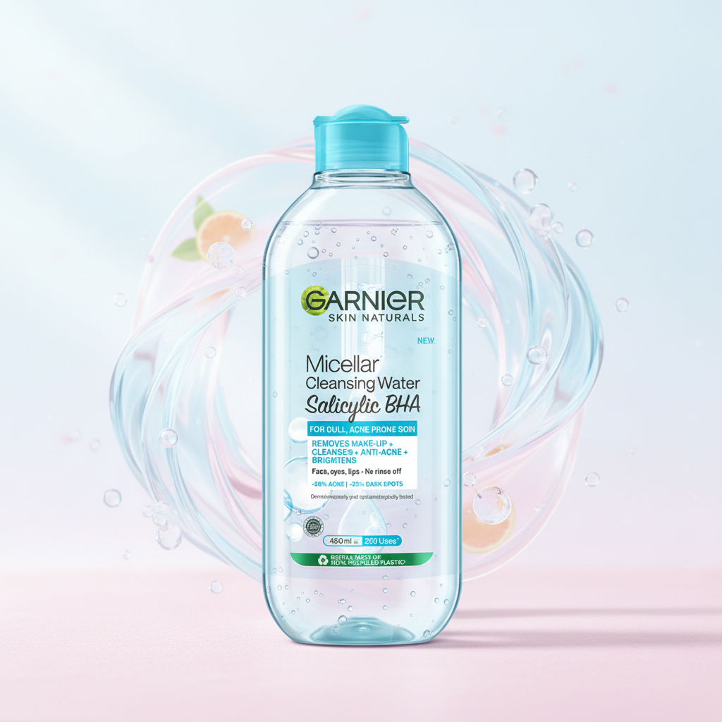- Nước Tẩy Trang Garnier Micellar Salicylic BHA 400ml kết hợp công nghệ Micellar với Salicylic BHA và dẫn xuất Vitamin C thích hợp cho làn da bị mụn lần đầu tiên.